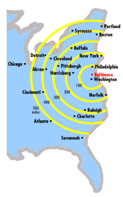 Strategically located in the Mid-Atlantic region of the U.S. east coast, Baltimore sits in the center of the enormous Washington/Baltimore Common Market. This inland location makes it the closest Atlantic port to major Midwestern population and manufacturing centers and a day's reach to 1/3 of U.S. households.
